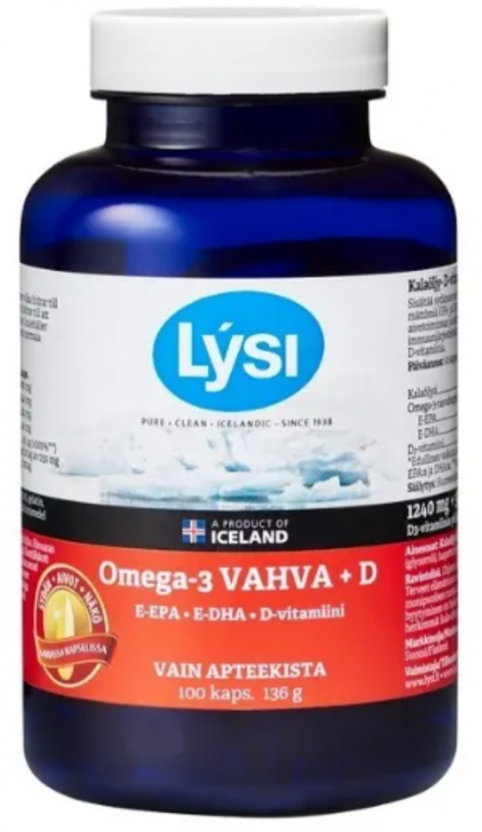 Lysi Omega-3 Vahva + D3 содержит жирные кислоты, оказывающие положительное влияние на работу сердца и мозга. Витамин D3 способствует укреплению мышц и костной ткани, поддерживает иммунитет. Не содержит лактозу,глютен, дрожжи.